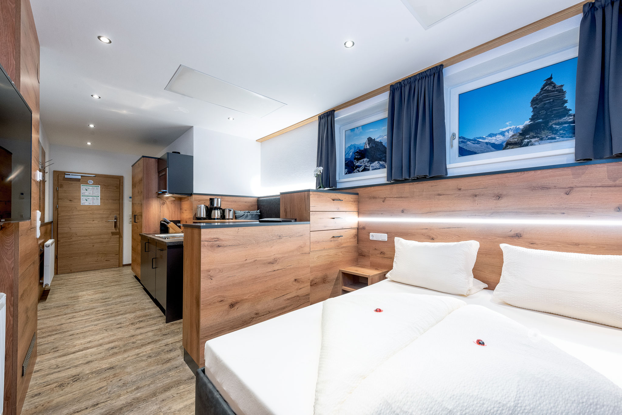 Die voll ausgestattete Küchenzeile, das bequeme Doppelbett und der gemütliche Wohnbereich laden zum Entspannen und Genießen ein. Trotz fehlendem direktem Tageslicht sorgt das durchdachte Design für eine helle und angenehme Atmosphäre.