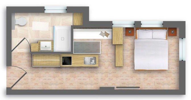 The fully equipped kitchenette, comfortable double bed, and cozy living area invite you to relax and enjoy yourself. Despite the lack of direct natural light, the thoughtful design creates a bright and pleasant atmosphere.
